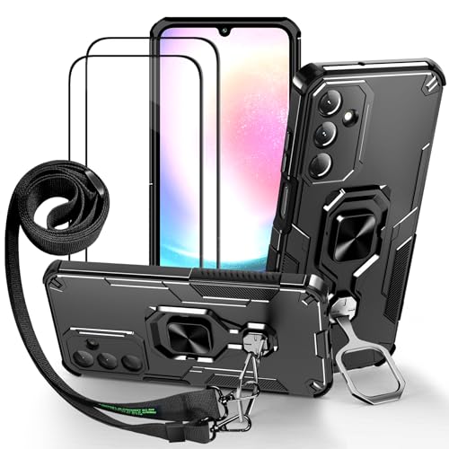 Lonjanfon Outdoor Coque avec Cordon pour Samsung Galaxy A25, Support 360°Rotatif, 2 HD Verre Trempé, Militaire Antichoc Housse Etui pour Samsung A25 5G/4G - Noir