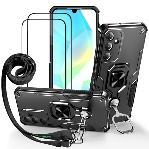 Lonjanfon Outdoor Coque avec Cordon pour Samsung Galaxy A16, Support 360°Rotatif, 2 HD Verre Trempé, Militaire Antichoc Housse Etui pour Samsung A16 5G/4G - Noir