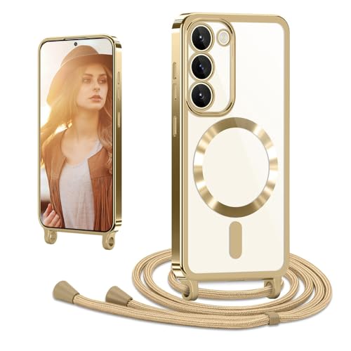 CaseLover Coque avec Cordon pour Samsung Galaxy S23, Coque Magnétique de Cellulaire Corde Transparent Silicone Étui en Galvanisé avec Réglable Collier Téléphone Chaîne Lanyard Housse pour S23 5G, Or