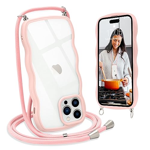 L-FADNUT Chaîne de Téléphone Portable pour iPhone 15 Pro Max Coque avec Lanière Silicone avec Cordon à Porter Autour du Cou Transparent Coque de Protection pour iPhone 15 Pro Max Rose