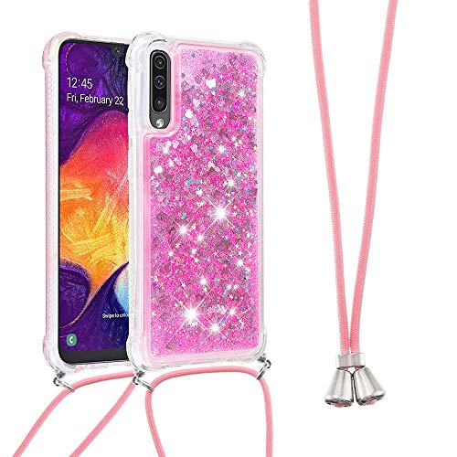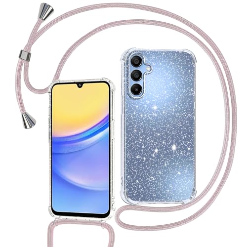 Tikgue Coque pour Samsung Galaxy A15 5G avec Cordon, Collier Coque Glitter Transparent Paillettes Etui TPU Bumper Silicone Case avec Chaîne Lanière Housse - Or Rose