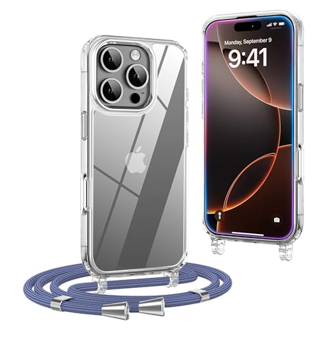 OLEPHY Coque avec Cordon pour iPhone 16 Pro 6,3'', Coque avec Collier Ajustable, [Antichoc] [Anti-Rayures] Cover avec Tour de Cou, Bleu