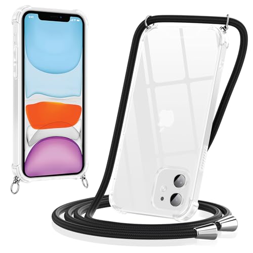 Yoedge Coque pour iPhone 11 avec Cordon 6,1", Transparente Coque Collier Réglable Téléphone Étui Portable Lanyard Housse, Etui avec PC + TPU Bumper Anti-Chute Protection Case, Noir