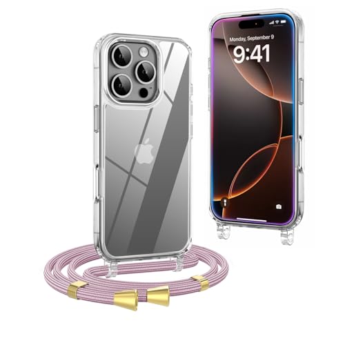 OLEPHY Coque avec Cordon pour iPhone 16 Pro 6,3'', Coque avec Collier Ajustable, [Antichoc] [Anti-Rayures] Cover avec Tour de Cou, Or Rose