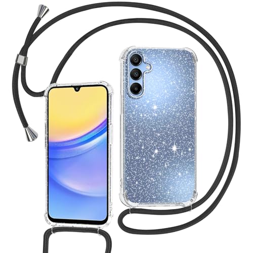 Tikgue Coque pour Samsung Galaxy A15 5G avec Cordon, Collier Coque Glitter Transparent Paillettes Etui TPU Bumper Silicone Case avec Chaîne Lanière Housse - Le Noir