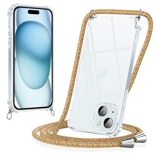 Yoedge Coque pour iPhone 15 avec Cordon 6,1", Transparente Coque Collier Réglable Téléphone Étui Portable Lanyard Housse, Etui avec PC + TPU Bumper Anti-Chute Protection Case, Arc-en-Ciel