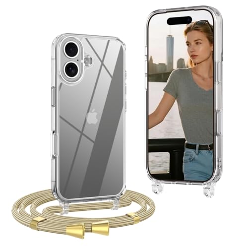 OLEPHY Coque avec Cordon pour iPhone 16 6,1'', Coque avec Collier Ajustable, [Antichoc] [Anti-Rayures] Cover avec Tour de Cou, Doré