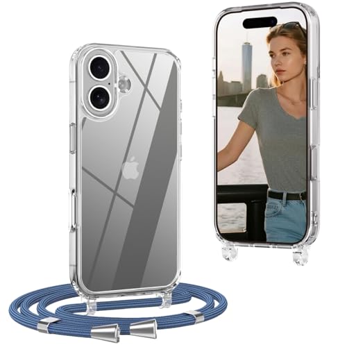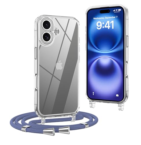 OLEPHY Coque avec Cordon pour iPhone 16 6,1'', Coque avec Collier Ajustable, [Antichoc] [Anti-Rayures] Cover avec Tour de Cou, Bleu