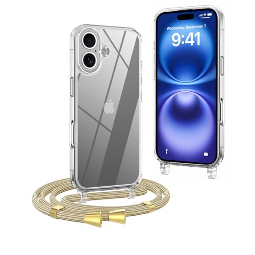 OLEPHY Coque avec Cordon pour iPhone 16 Plus 6,7'', Coque avec Collier Ajustable, [Antichoc] [Anti-Rayures] Cover avec Tour de Cou, Doré