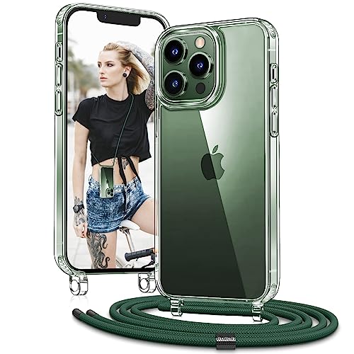 Vaykwo Cordon Coque pour iPhone 13 Pro Max 6,7'', Coque avec Collier Réglable pour iPhone 13 Pro Max, Protection Complète Transparente avec Tour de Cou, Vert Foncé