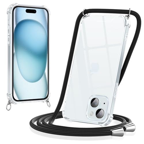 Yoedge Coque pour iPhone 13 / iPhone 14 avec Cordon 6,1", Transparente Coque Collier Réglable Téléphone Étui Portable Lanyard Housse, Etui avec PC + TPU Bumper Anti-Chute Protection Case, Noir