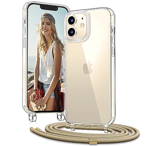 Vaykwo Cordon Coque pour iPhone 12 Mini 5.4'', Coque avec Collier Réglable pour iPhone 12 Mini, Protection Complète à 360 Degrés Transparente avec Tour de Cou, Or