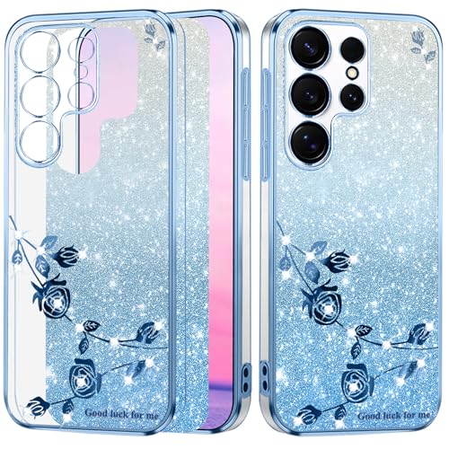 Yarxiawin Étui pour Samsung Galaxy S25 Ultra Silicone Glitter Mince, Effet Paillette pour Samsung S25 Ultra Coque Transparente Doux Fleur Housse Souple Rose Case Antichoc (Bleu)