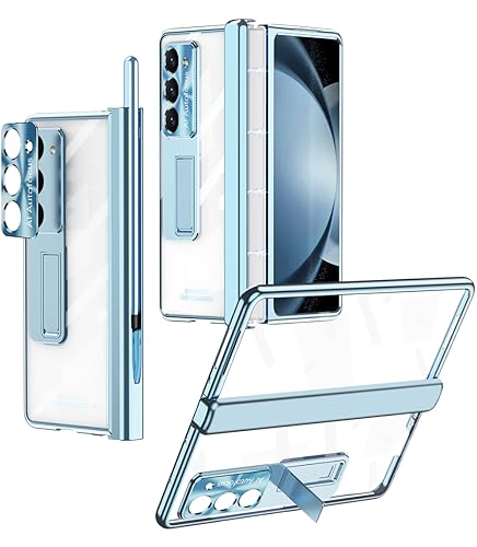 Miimall pour Coque Samsung Z Fold 5 avec Stylet + Double Protection des Charnières + Béquille +Protection de Caméra + Protecteur pour Écran Avant, Transparent Ultra-Mince pour Galaxy Z Fold 5 (Bleu)