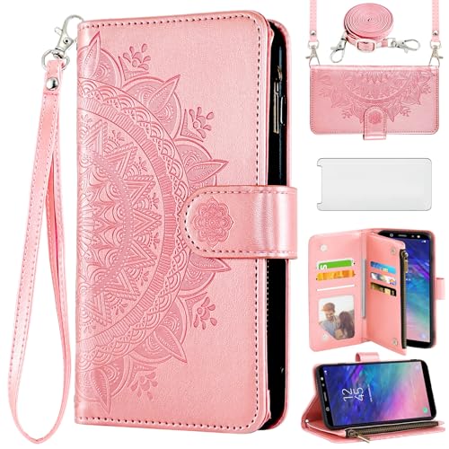 Asuwish Coque pour Samsung Galaxy A6 2018 Portefeuille avec Verre Trempé et Cordon Porte Carte Chaine PU Cuir à Clapet Fleur Vitre Protection Mandala Housse Support 6A Téléphone Case Femme Rosegold