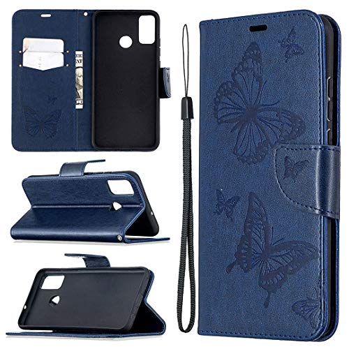 SATURCASE Coque pour Huawei Honor 9X Lite, Papillon Gaufrage PU Cuir Magnétique Flip Portefeuille Support Porte-Carte Dragonne Protecteur Housse Étui pour Huawei Honor 9X Lite (LD-Bleu)