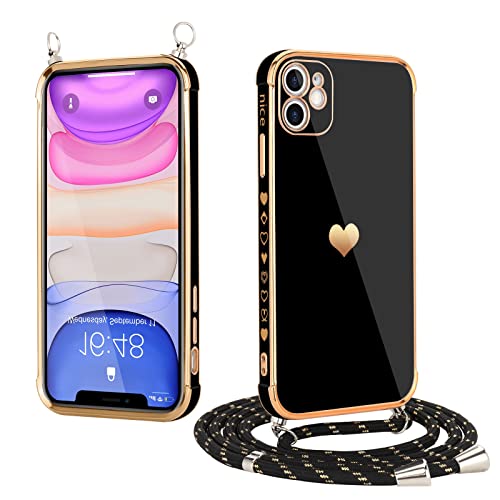 Mkej Coque pour iPhone 11 avec Cordon de Collier, Coque avec Cordon Motif Coeur d'amour TPU Housse, Collier RéglableTéléphone Portable Lanyard Case iPhone 11, Or Noir