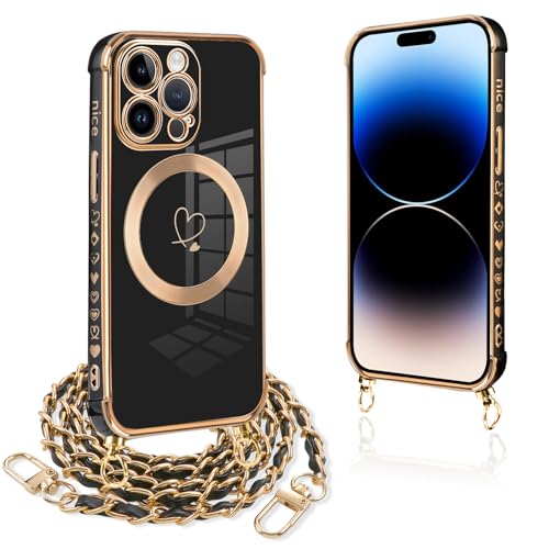 Pnakqil Coque Magnétique pour iPhone 14 Pro Max Con Cordon, Compatible avec MagSafe, Silicone Housse avec Motif Coeur d'amour Collier Lanyard, Antichoc Etui pour iPhone 14Pro Max 6.7", Chaine-Noir Or