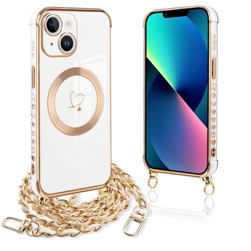 HZLFCZL Coque pour iPhone 14 Plus avec La chaîne Coque,Compatible avec MagSafe,Protection de lentille de caméra,Luxe en Forme de cœur avec Chaine Soft TPU Case for iPhone 14 Plus-Blanc