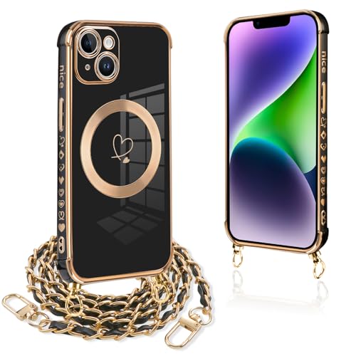 Pnakqil Coque Magnétique pour iPhone 14 Plus Con Cordon, Compatible avec MagSafe, Silicone Housse avec Motif Coeur d'amour Collier Lanyard, Antichoc Etui pour iPhone 14Plus 6.7 Pouces, Chaine-Noir Or