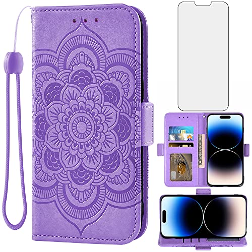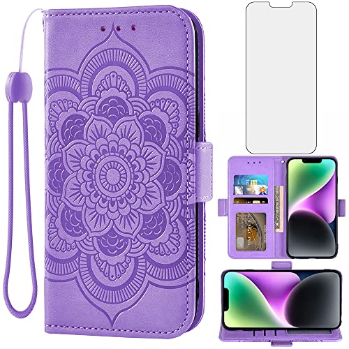 Asuwish Coque pour iPhone 14 Portefeuille avec Verre Trempé et Porte Carte Chaine PU Cuir à Clapet Mandala Étui Housse Support i 14coque Fleur Vitre Protection Protege Etui Téléphone Case Femme Violet