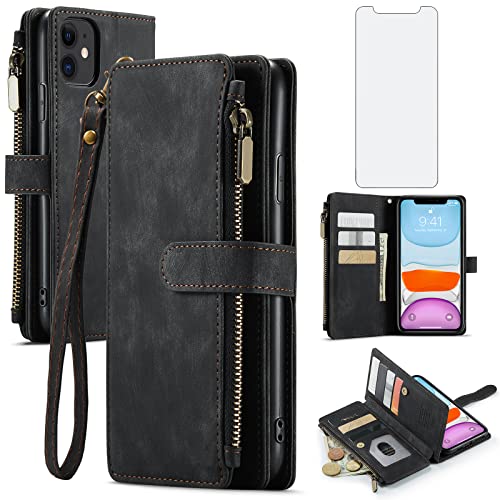 Asuwish Coque pour iPhone 11 Portefeuille avec Verre Trempé et Porte Carte Chaine PU Cuir à Clapet Étui Housse Support i Phone11 Téléphone Vitre Protection Protege Ecran Etui Case Femme Homme Noir