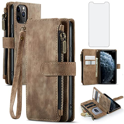 Asuwish Coque pour iPhone 12 Pro Portefeuille avec Verre Trempé et Porte Carte Chaine PU Cuir à Clapet Étui Housse Support i 12Pro Plus 6.1 Téléphone Vitre Protection Protege Case Femme Homme Marron