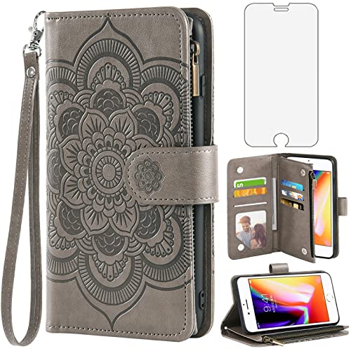 Asuwish Coque pour iPhone 7/8/SE 2020 2022 Portefeuille avec Verre Trempé et Porte Carte Chaine PU Cuir à Clapet Mandala i SE2020 SE2022 2 3 EME Generation 7s 8s SE2 SE3 Téléphone Case Femme Gris