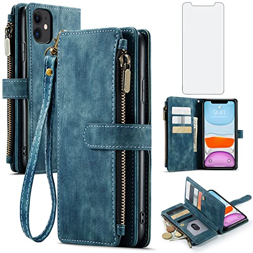 Asuwish Coque pour iPhone 11 Portefeuille avec Verre Trempé et Porte Carte Chaine PU Cuir à Clapet Étui Housse Support i Phone11 Téléphone Vitre Protection Protege Ecran Etui Case Femme Homme Bleu