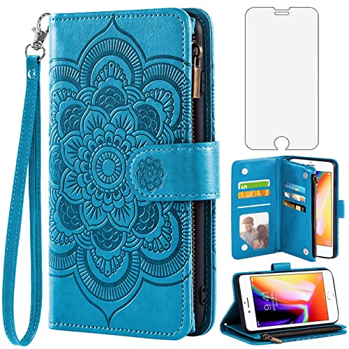 Asuwish Coque pour iPhone 7/8/SE 2020 2022 Portefeuille avec Verre Trempé et Porte Carte Chaine PU Cuir à Clapet Mandala i SE2020 SE2022 2 3 EME Generation 7s 8s SE2 SE3 Téléphone Case Femme Bleu