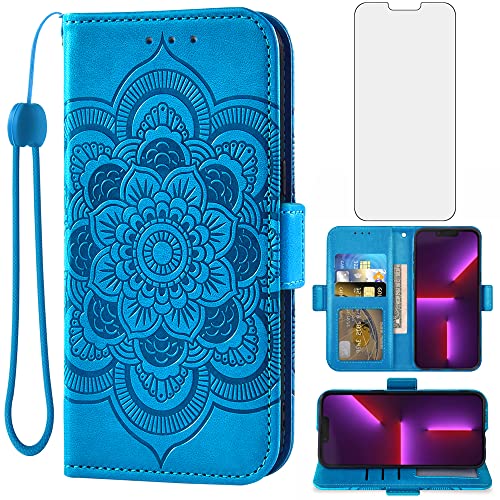 Asuwish Coque pour iPhone 13 Portefeuille avec Verre Trempé et Porte Carte Chaine PU Cuir à Clapet Mandala Étui Housse Support i 13Coque A2633 Protege Ecran Antichoc Etui Téléphone Case Femme Bleu
