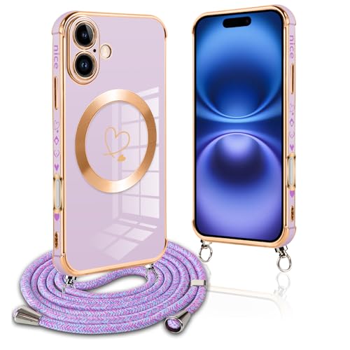 Pnakqil Coque Magnétique pour iPhone 16 Con Cordon, Compatible avec MagSafe, Silicone Housse avec Motif Coeur d'amour Réglable Collier Lanyard, Antichoc Etui pour iPhone 16 6.1 Pouces, Chaine-Violet