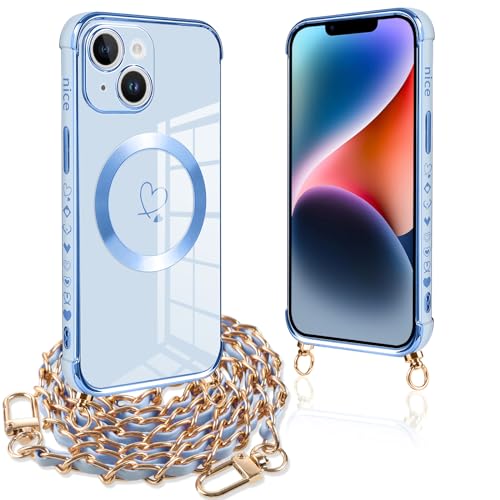 Pnakqil Coque Magnétique pour iPhone 14 Con Cordon, Compatible avec MagSafe, Silicone Housse avec Motif Coeur d'amour Collier Lanyard, Antichoc Etui pour iPhone 14 6.1 Pouces, Chaine-Bleu Or