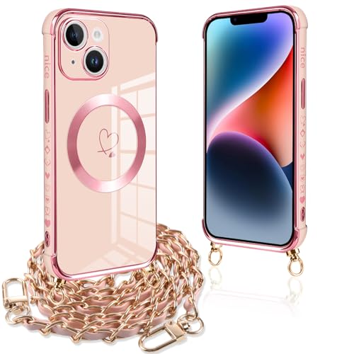 Pnakqil Coque Magnétique pour iPhone 14 Con Cordon, Compatible avec MagSafe, Silicone Housse avec Motif Coeur d'amour Collier Lanyard, Antichoc Etui pour iPhone 14 6.1 Pouces, Chaine-Rose Or