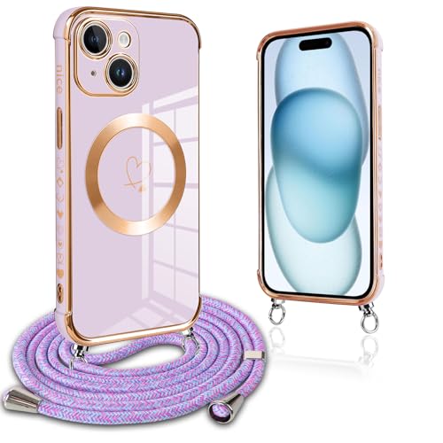 Pnakqil Coque Magnétique pour iPhone 15 Plus Con Cordon, Compatible avec MagSafe, Silicone Housse avec Motif Coeur d'amour Réglable Collier Lanyard, Antichoc Etui pour iPhone 15Plus, Chaine-Violet