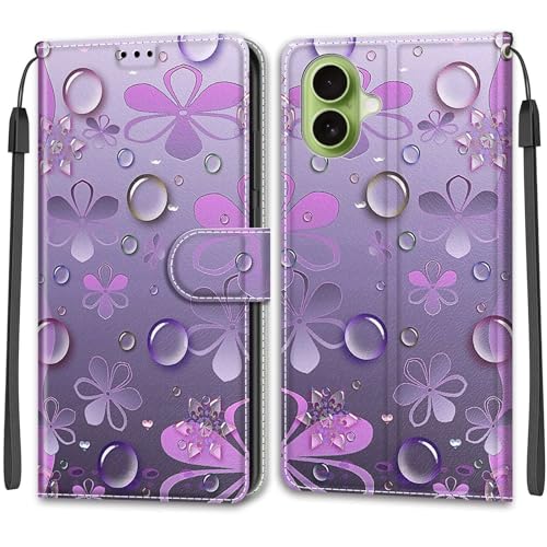 Fertuo Coque pour iPhone 16, Fleur Étui Housse en Cuir PU à Rabat Portefeuille Antichoc avec Porte Carte, Poche Zippée, Chiusura Magnétique, Dragonne et Support Cover Case Femme, Violet