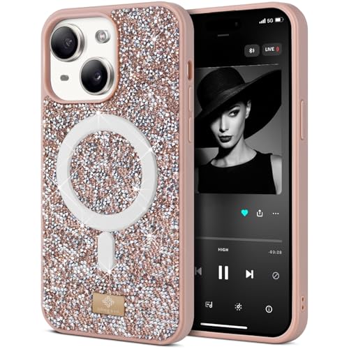 BEZ Coque pour iPhone 15 Paillette Glitter, Compatible avec MagSafe, Coque Series de Etuis avec Bling & Co., Étui Magnétique en Diamant Etincelant et à Cristal Bling, Beige Toscan