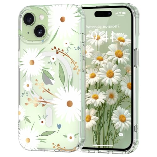 Pepmune Coque Magnétique Florale pour iPhone 15 [Compatible avec Magsafe], Coque de Transparente Anti-jaunissement, Joli Motif Floral Anti-Rayures, Protection TPU pour Filles et Femmes-Blanc