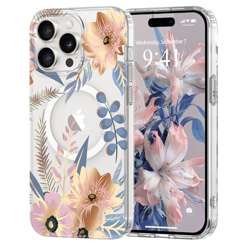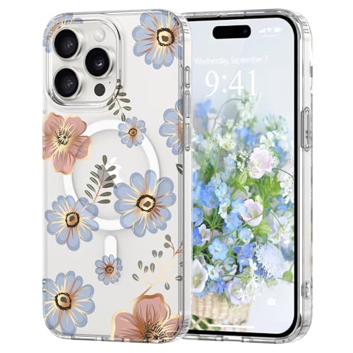 Pepmune Coque Magnétique Florale pour iPhone 15 Pro Max [Compatible avec Magsafe], Coque de Transparente Anti-jaunissement, Joli Motif Floral Anti-Rayures, Protection TPU pour Filles et Femmes-Bleu