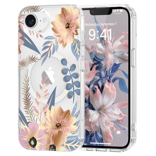 Pepmune Coque Magnétique Florale pour iPhone 16e [Compatible avec Magsafe], Coque de Transparente Anti-jaunissement, Joli Motif Floral Anti-Rayures, Protection TPU pour Filles et Femmes-Rose
