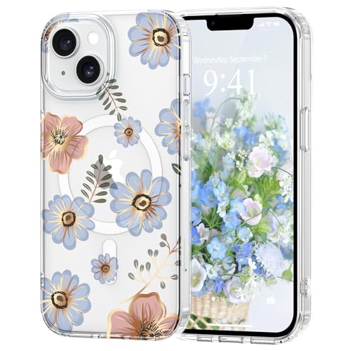 Pepmune Coque Magnétique Florale pour iPhone 14/13 [Compatible avec Magsafe], Coque de Transparente Anti-jaunissement, Joli Motif Floral Anti-Rayures, Protection TPU pour Filles et Femmes-Bleu