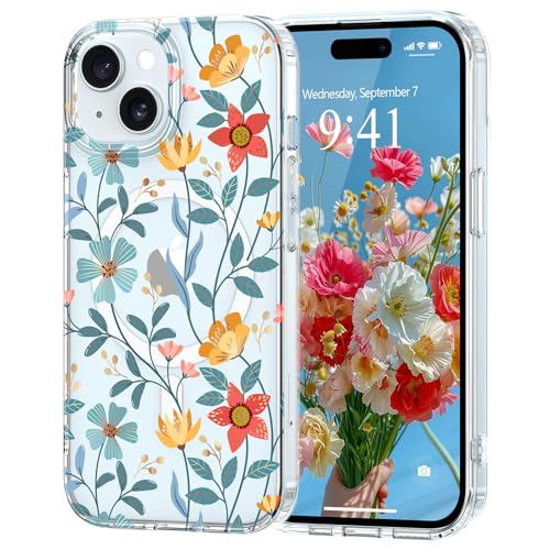 Pepmune Coque Magnétique Florale pour iPhone 15 [Compatible avec Magsafe], Coque de Transparente Anti-jaunissement, Joli Motif Floral Anti-Rayures, Protection TPU pour Filles et Femmes-Bleu