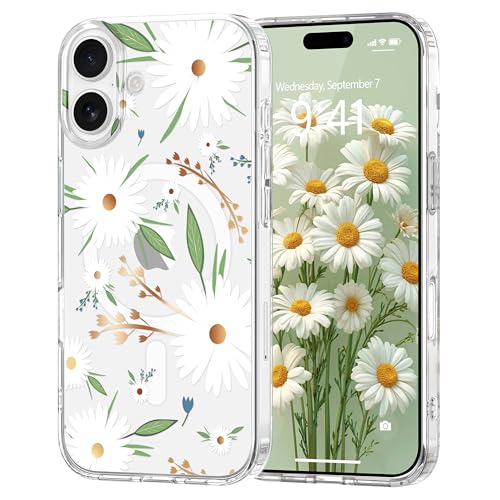 Pepmune Coque Magnétique Florale pour iPhone 16 [Compatible avec Magsafe], Coque de Transparente Anti-jaunissement, Joli Motif Floral Anti-Rayures, Protection TPU pour Filles et Femmes-Blanc