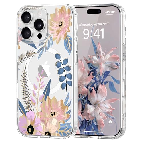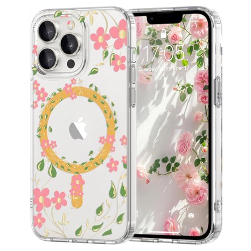 Pepmune Coque Magnétique Florale pour iPhone 16 Pro Max [Compatible avec Magsafe], Coque de Transparente Anti-jaunissement, Joli Motif Floral Anti-Rayures, Protection TPU pour Filles et Femmes-Rose