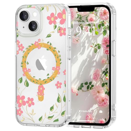Pepmune Coque Magnétique Florale pour iPhone 14/13 [Compatible avec Magsafe], Coque de Transparente Anti-jaunissement, Joli Motif Floral Anti-Rayures, Protection TPU pour Filles et Femmes-Rose