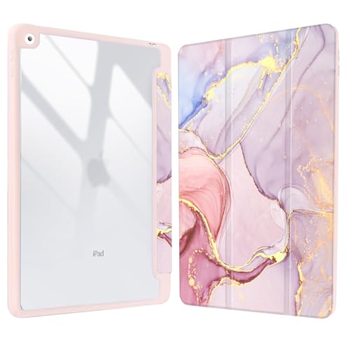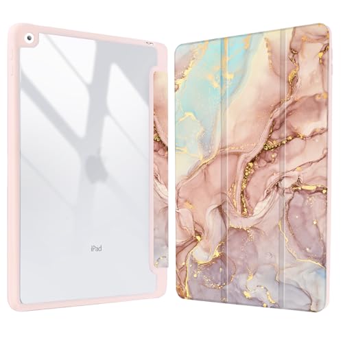 Vozehui 10.2 Pouces Coque Marbre Compatible iPad 9ème/8ème/7ème Génération 2021/2020/2019 Coque avec Coque arrière Transparente avec Porte-Crayons,réveil Automatique du Sommeil Marbre Rose