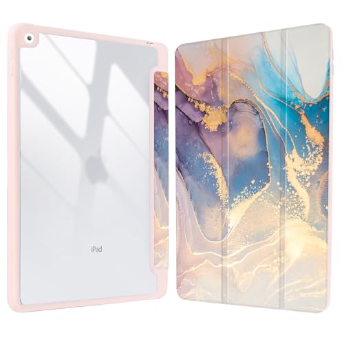 Vozehui 10.2 Pouces Coque Marbre Compatible iPad 9ème/8ème/7ème Génération 2021/2020/2019 Coque avec Coque arrière Transparente avec Porte-Crayons,réveil Automatique du Sommeil