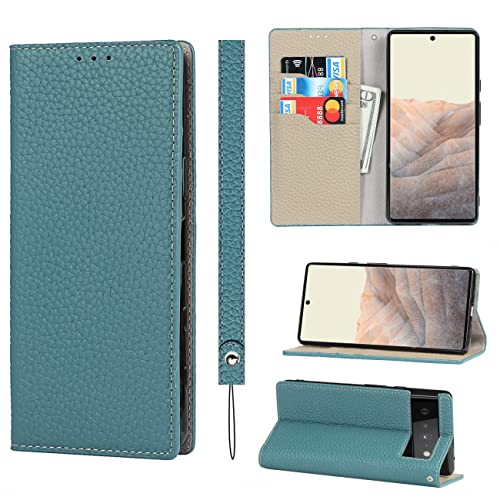 Copmob Coque Google Pixel 6,Cuir véritable Flip Portefeuille Étui en Cuir,[3 Fentes][Fermeture magnétique][RFID Blocker],Clapet Housse Etui Rabat pour Google Pixel 6 - Vert foncé
