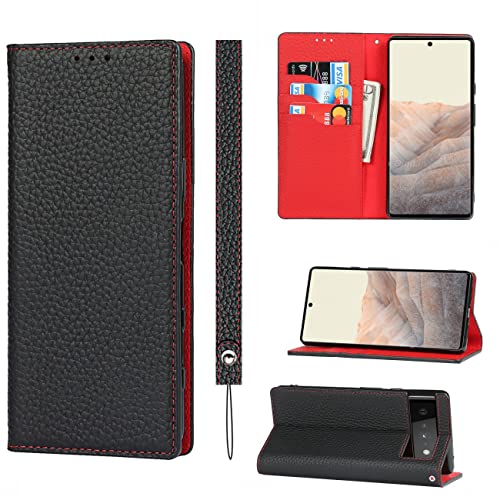 Copmob Coque Google Pixel 6,Cuir véritable Flip Portefeuille Étui en Cuir,[3 Fentes][Fermeture magnétique][RFID Blocker],Clapet Housse Etui Rabat pour Google Pixel 6 - Noir