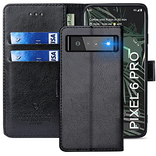 QLTYPRI Coque pour Google Pixel 6 Pro, Etui en Cuir PU Portefeuille Rétro Flip Case Antichoc Housse avec Fentes de Cartes Fonction Support - Noir